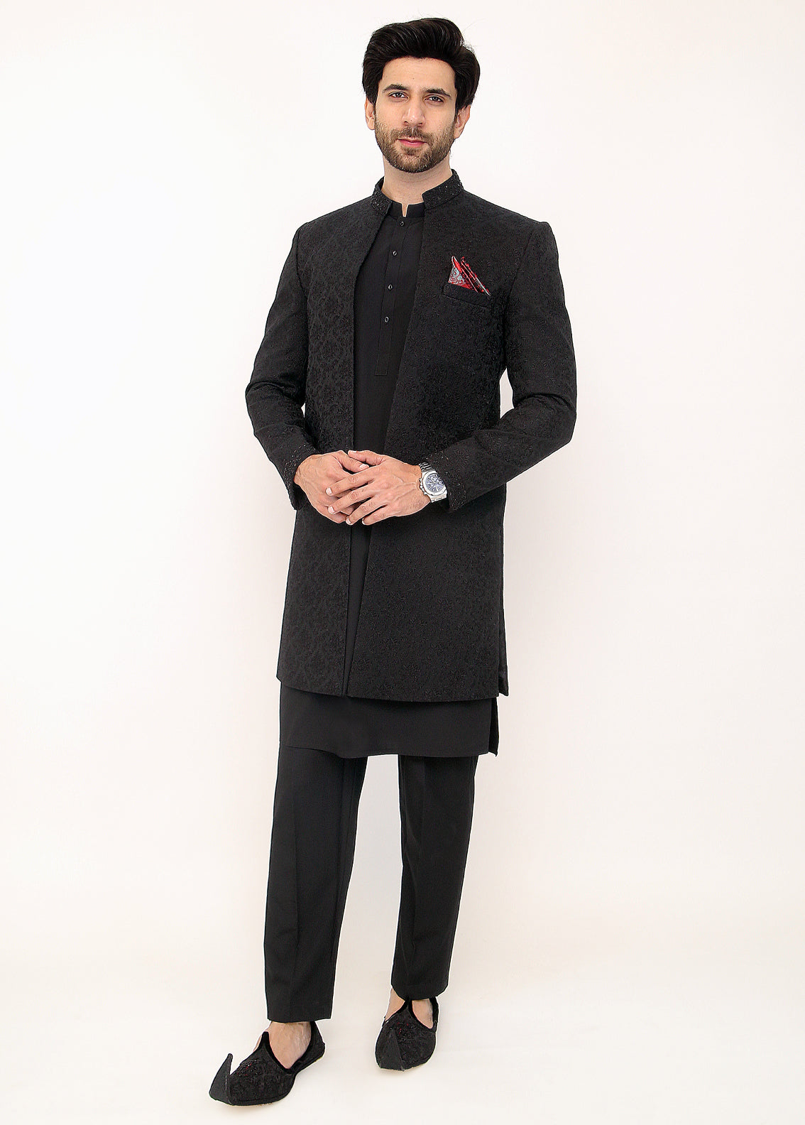 The Black Front Open Sherwani is a chic and sophisticated choice for grooms looking to make a stylish statement on their wedding day. This contemporary sherwani features a front-open design that offers a modern twist on traditional attire, providing both elegance and ease of movement. Crafted from high-quality fabrics, it ensures comfort throughout the celebrations. The deep black color adds a touch of drama and sophistication, making it perfect for evening ceremonies and formal events. Adorned with subtle embellishments and intricate detailing, the Black Front Open Sherwani captures a refined aesthetic that allows the groom to stand out with confidence and grace on his special day