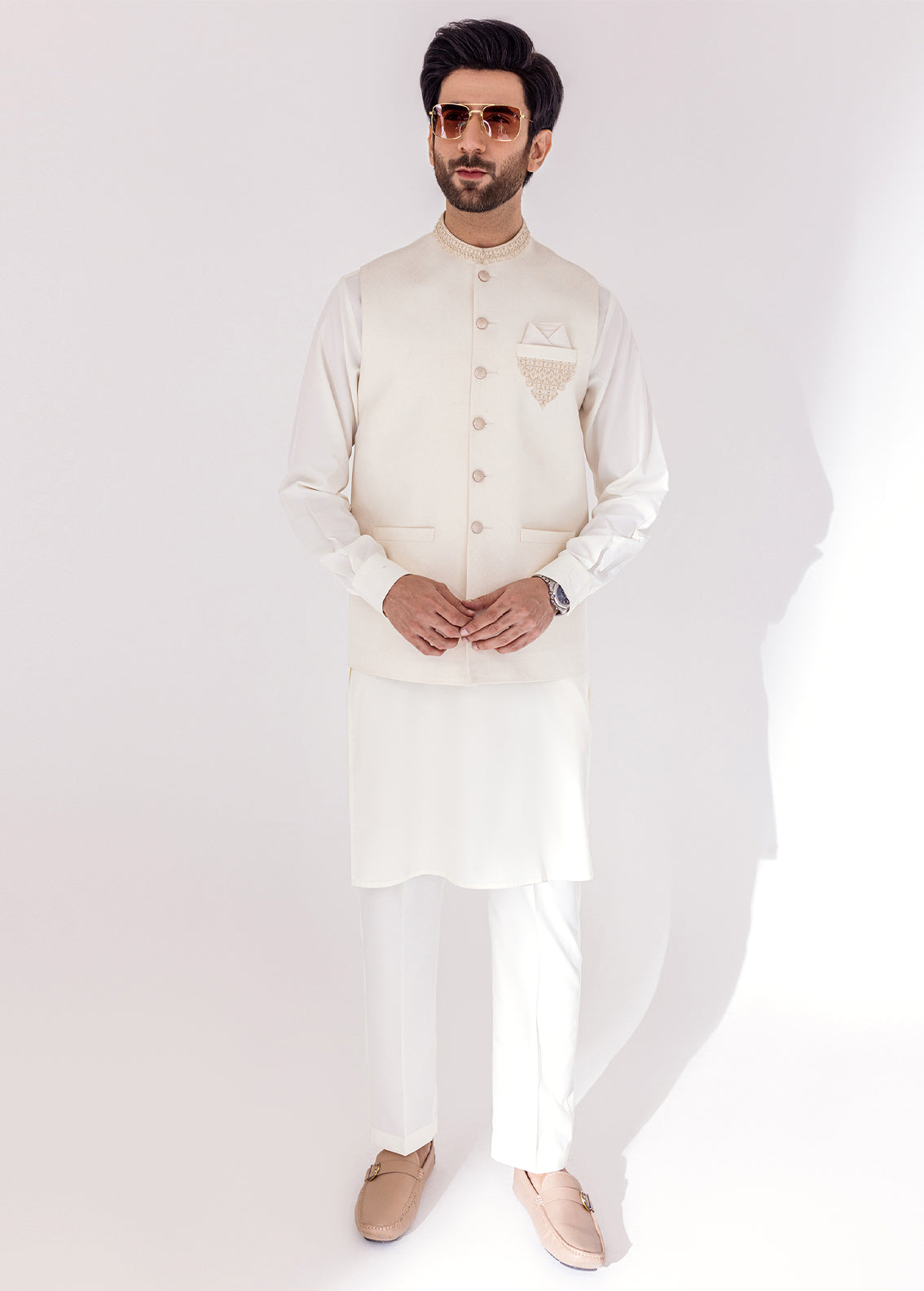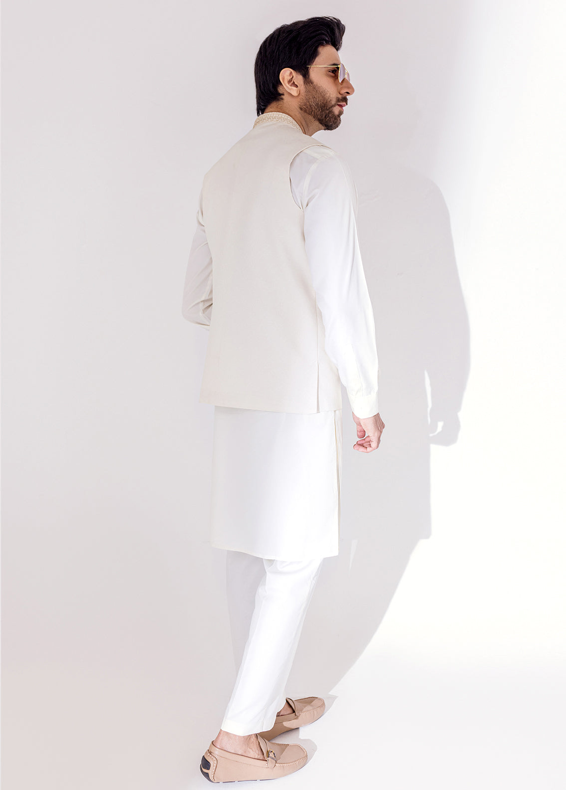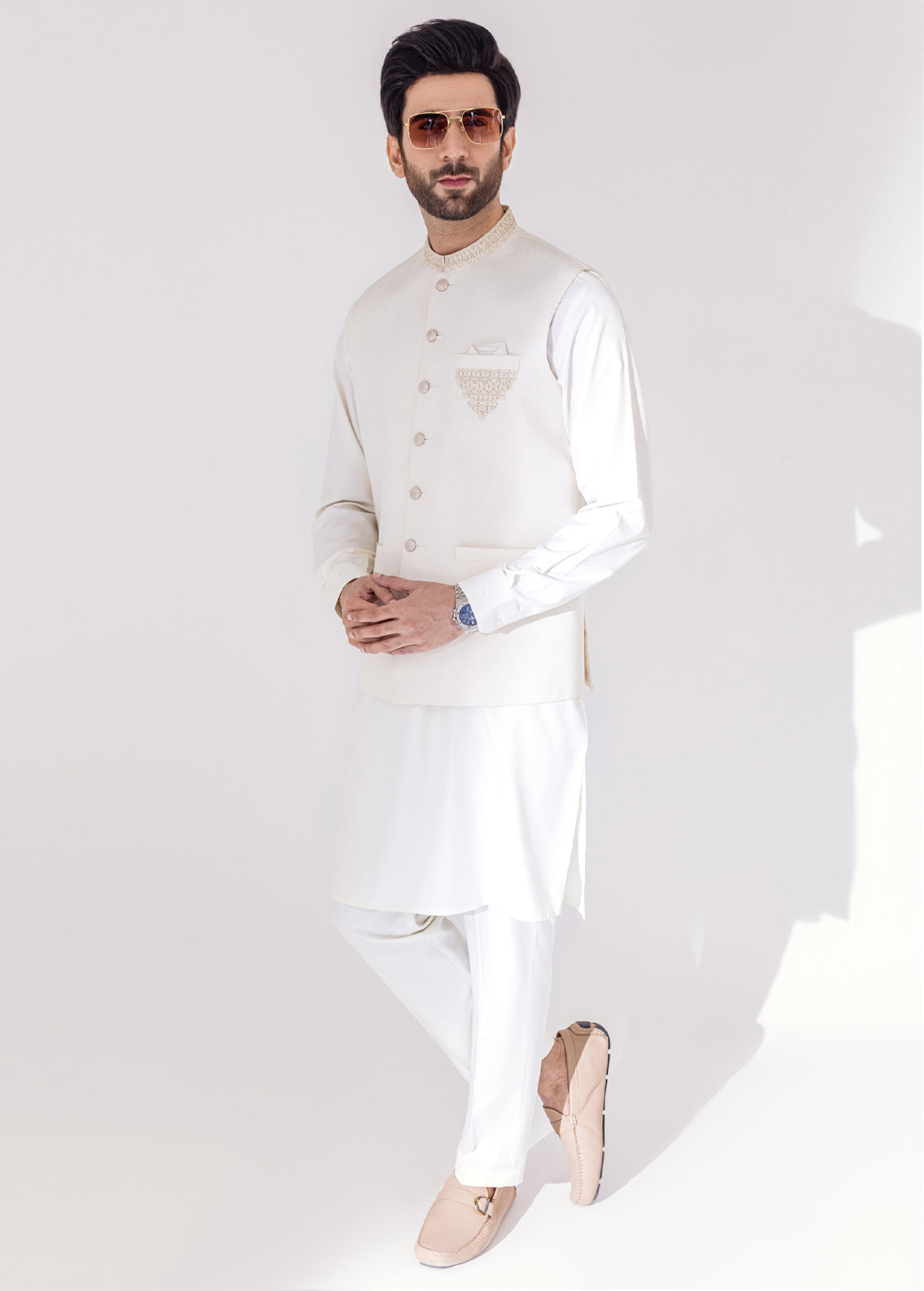 Refined and elegant, the White Embroidered men's waistcoat features intricate detailing, adding a touch of sophistication to any traditional or formal outfit. Perfect for weddings, festive occasions, and special gatherings.