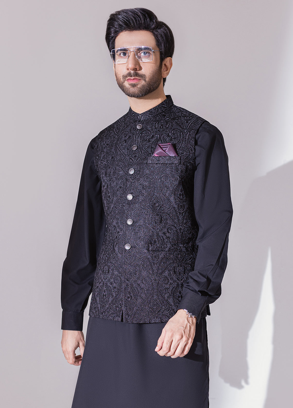 This black waistcoat exemplifies refined tailoring with comprehensive embroidery detailing across its surface. Each stitch demonstrates superior craftsmanship, creating dimensional patterns that enhance formal and semi-formal presentations. The garment's structured construction provides a sharp, defined silhouette suitable for weddings, business events, and cultural occasions. The embroidered embellishments offer textural interest without compromising versatility, allowing pairing with various dress shirts and jackets. An essential layering piece for discerning individuals seeking distinctive elegance with timeless appeal.