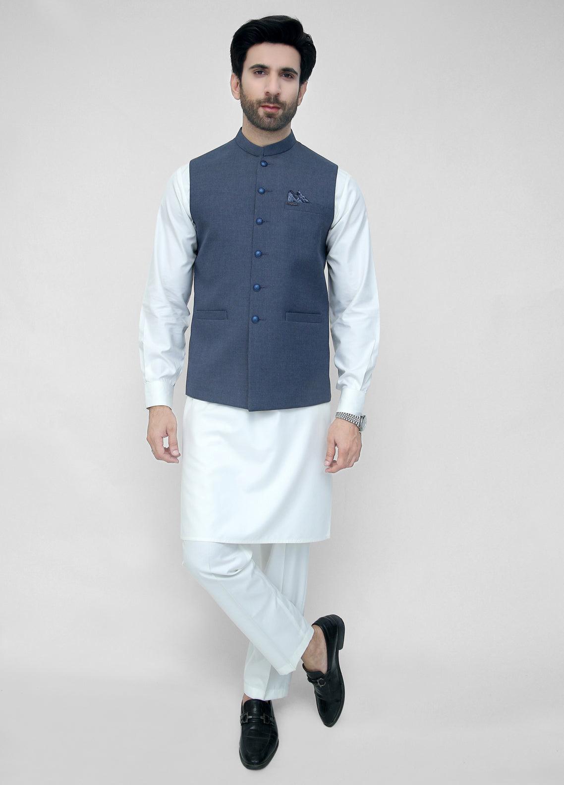Stylish and modern denim blue men's waistcoat, perfect for adding a contemporary touch to traditional and formal outfits. Ideal for weddings, festive events, and special occasions.