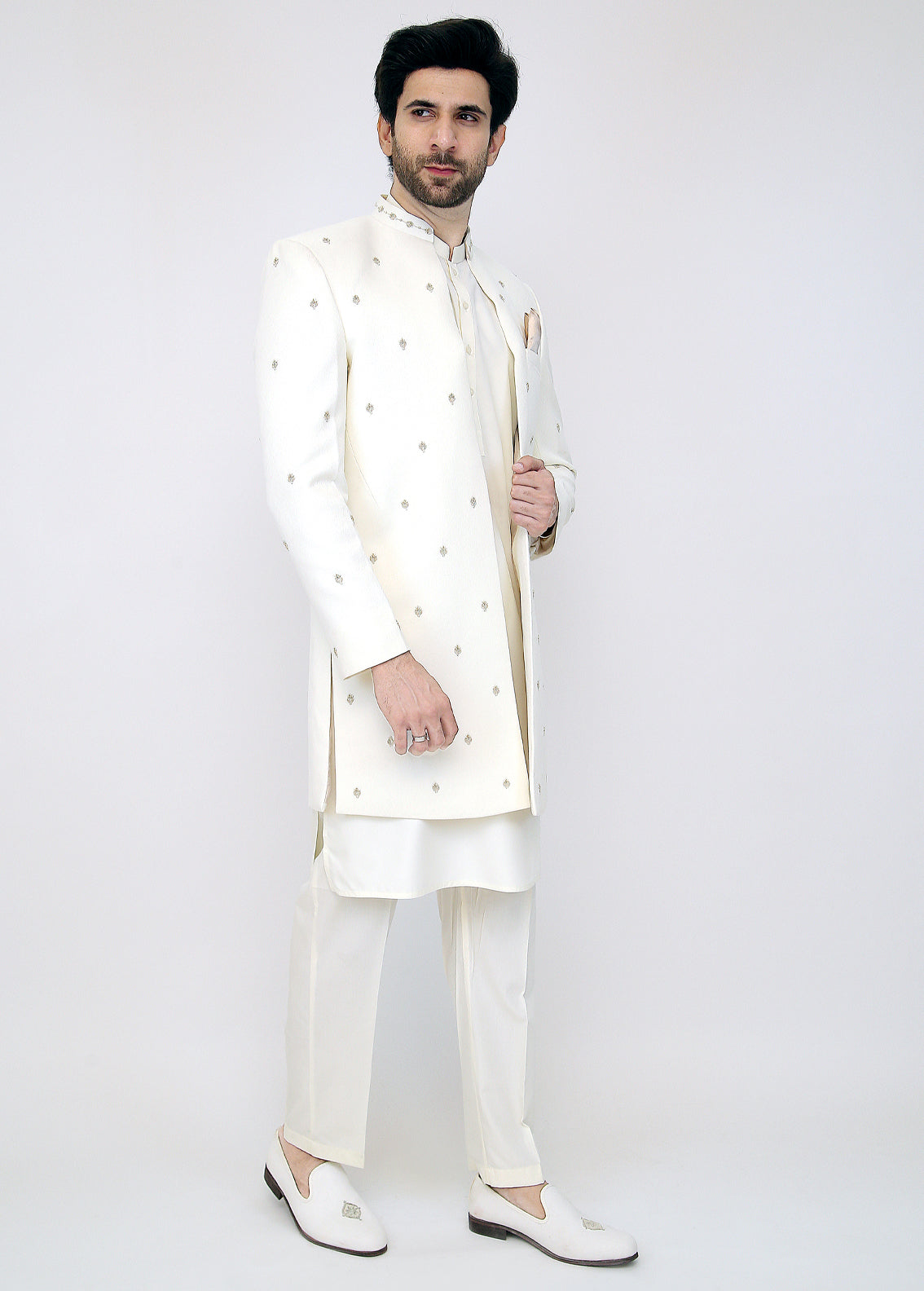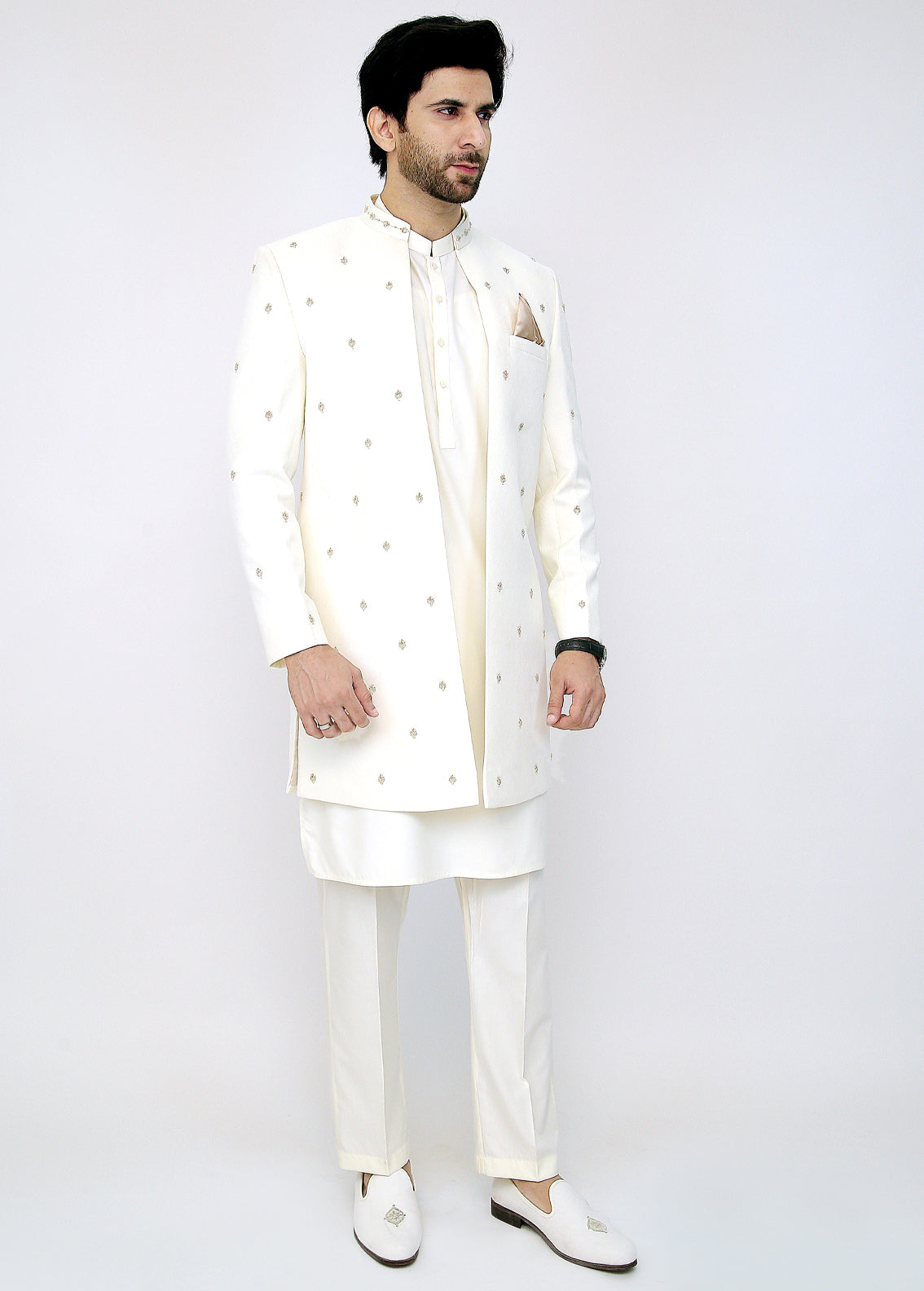The Off-White Embroidery Front Open Sherwani is a timeless and elegant choice for grooms seeking a sophisticated look for their wedding day. This stunning sherwani features a stylish front-open design, crafted from high-quality fabrics that ensure comfort and a perfect fit. The soft off-white color adds a touch of subtle elegance, making it ideal for both daytime and evening ceremonies. Adorned with intricate embroidery, this sherwani showcases exquisite craftsmanship, enhancing its luxurious appeal. Perfect for the modern groom who appreciates classic style with a contemporary twist, the Off-White Embroidery Front Open Sherwani guarantees a memorable appearance on this special occasion.
