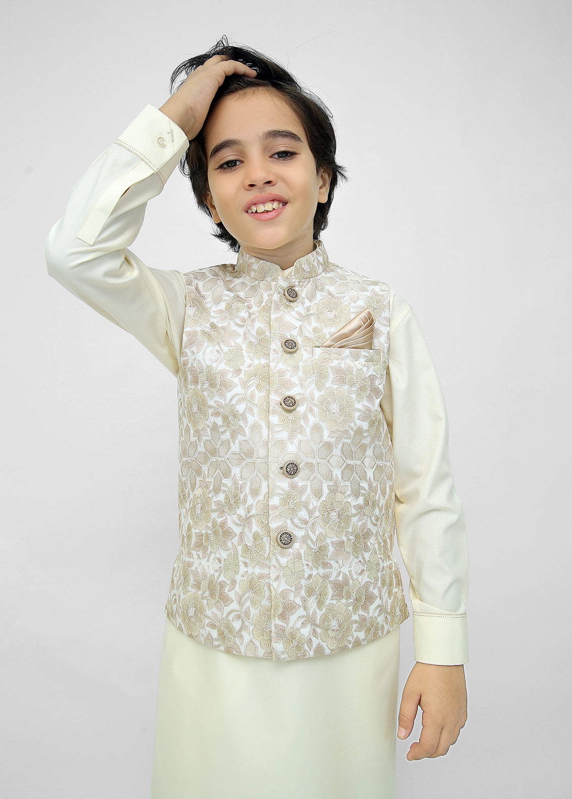 Upgrade your wardrobe with our Kids Embroidered Waistcoat Suit Off-White & Golden. Crafted with premium-quality fabric and refined stitching. Perfect for weddings, formal events, and cultural gatherings. Comfortable fit with an elegant look. Order online with fast delivery.