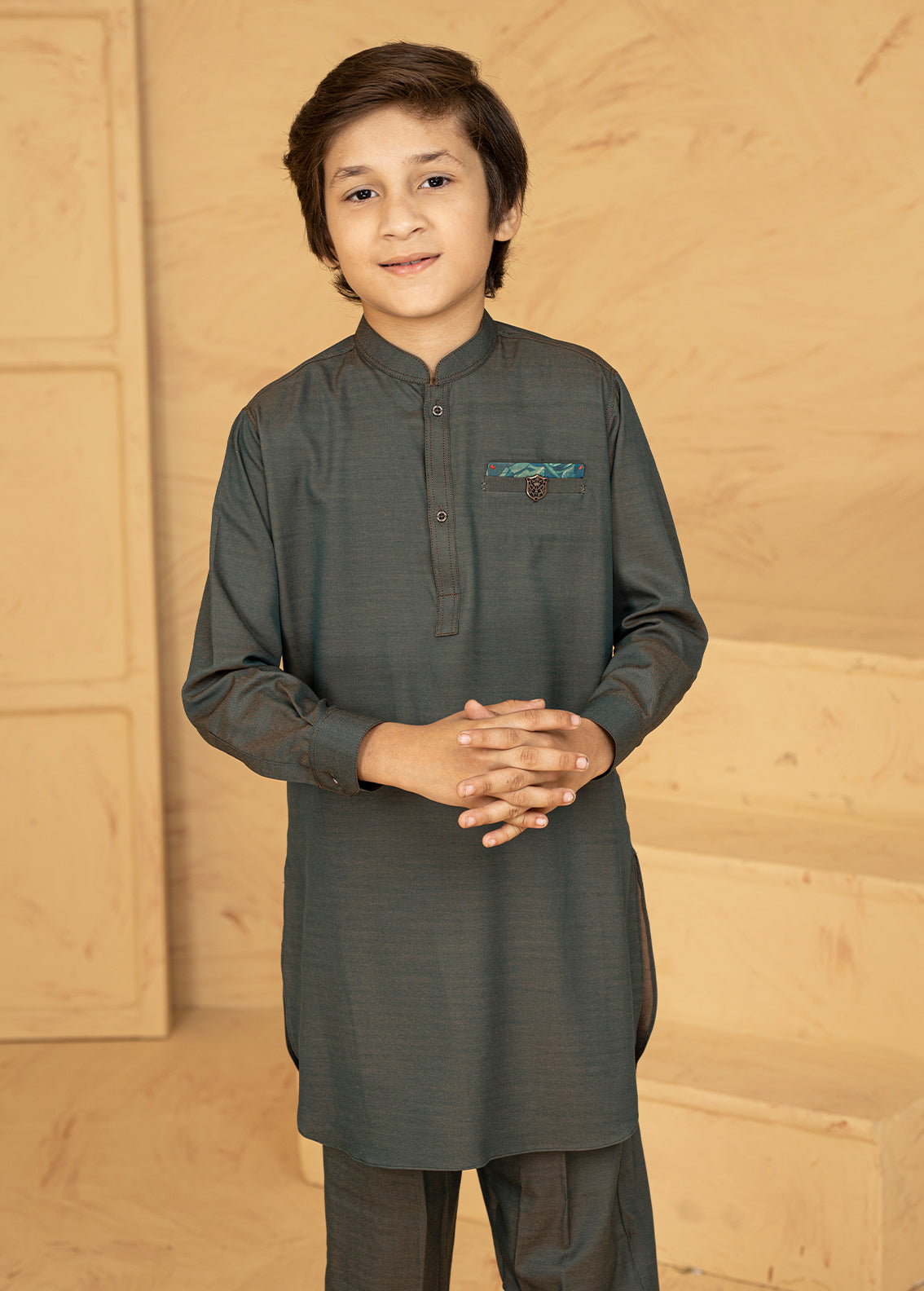 New Collection 2024, Dark Green Kids Kurta Pajama features lightweight fabrics, bright colors, and intricate embroidery, perfect for special occasions or cultural events.