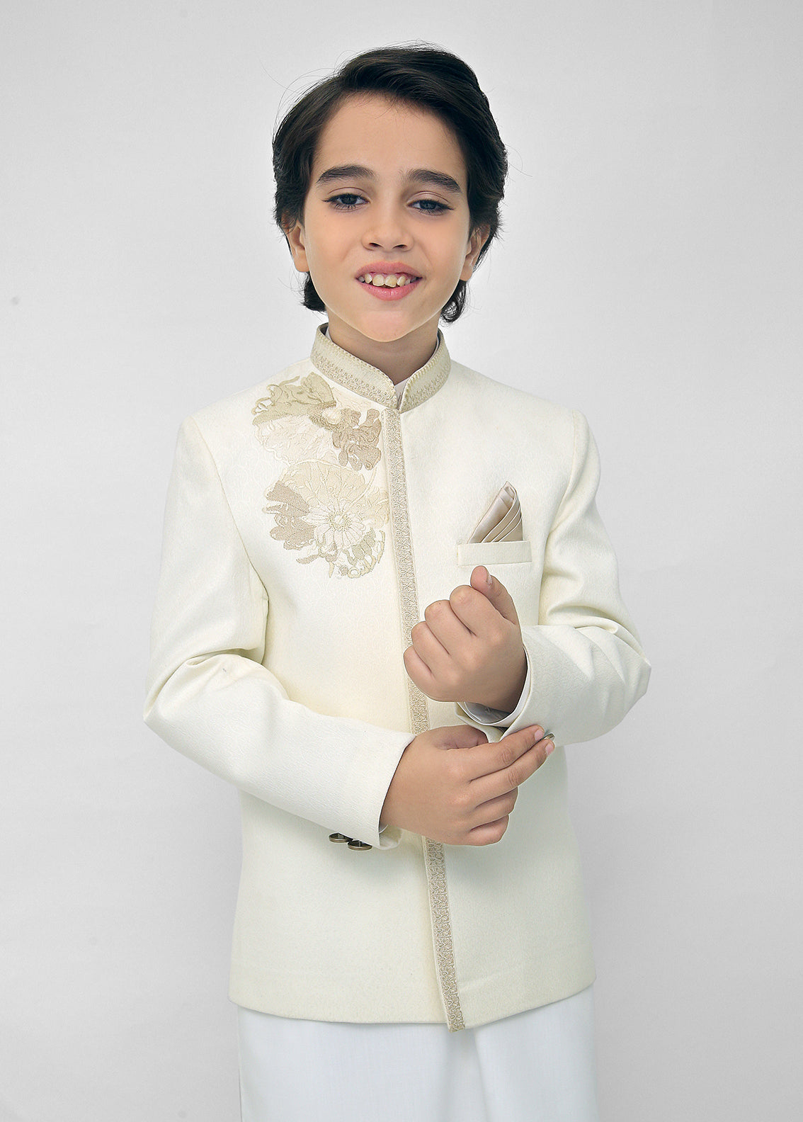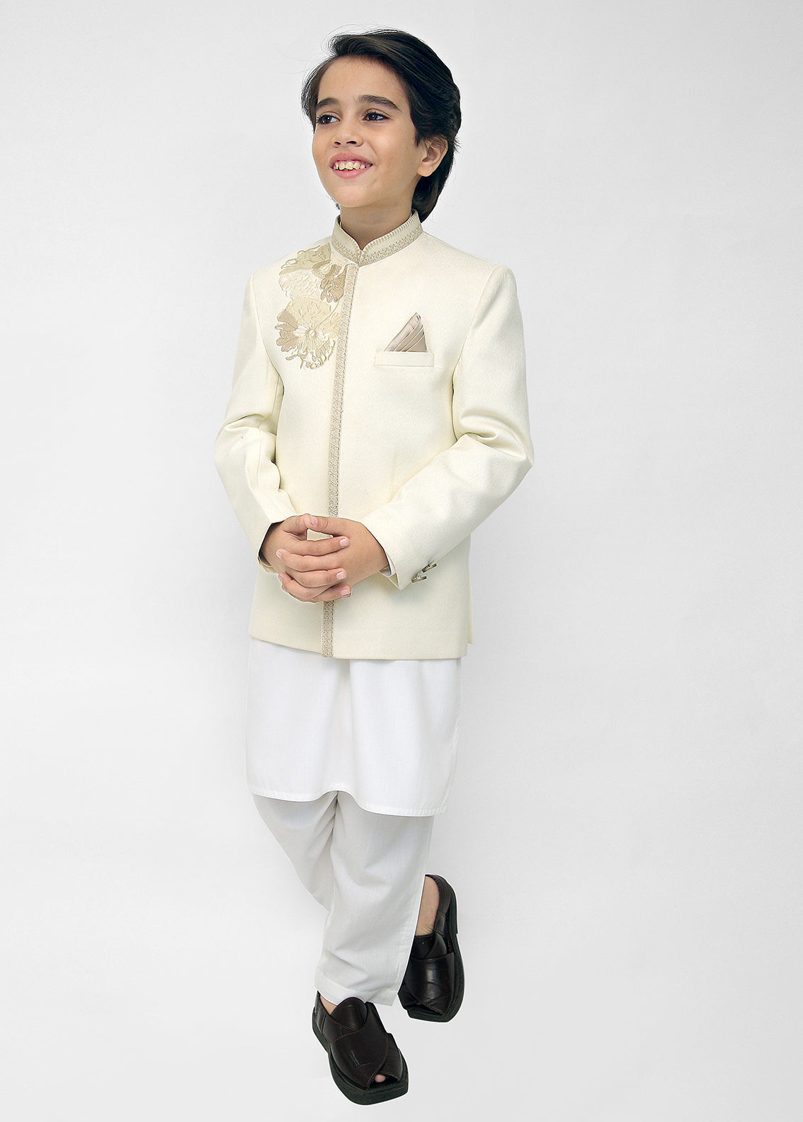 Upgrade your wardrobe with our Kids Off White Shalwar Kameez With Cream Emb Prince Coat. Crafted with premium-quality fabric and refined stitching. Perfect for weddings, formal events, and cultural gatherings. Comfortable fit with an elegant look. Order online with fast delivery.