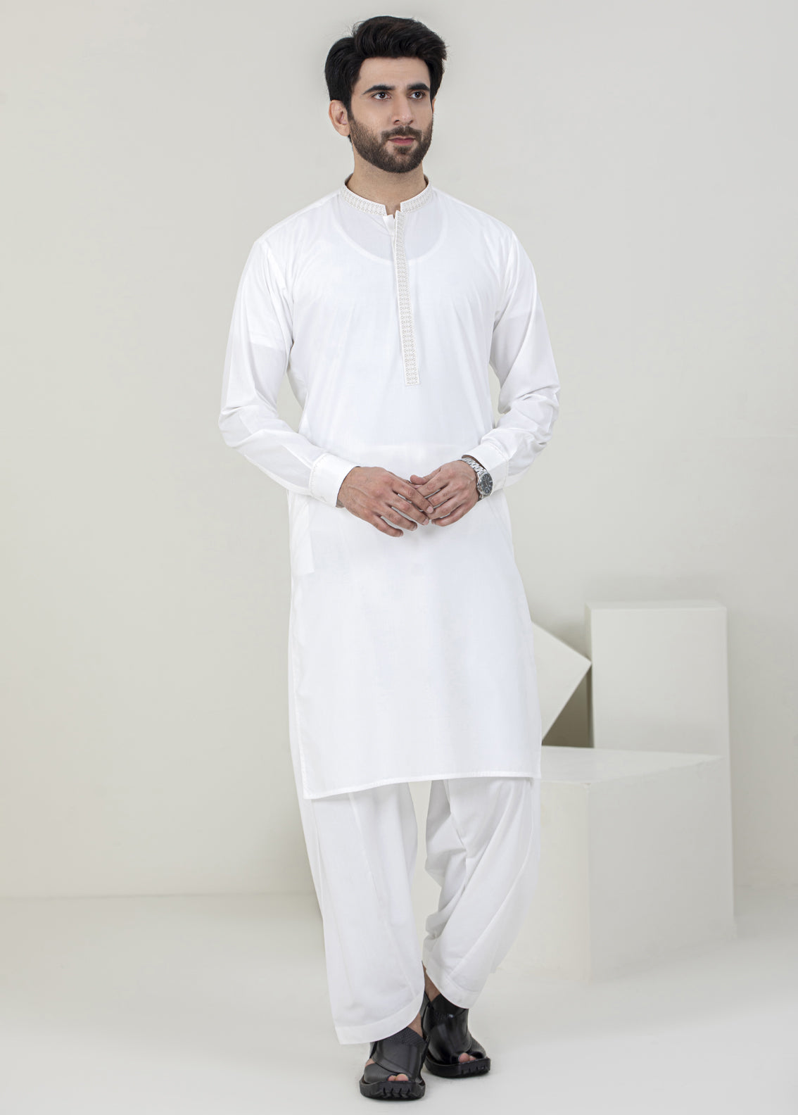 Our White Men Shalwar Kameez is made with a premium fabric. This Men's Kameez Shalwar combines comfort, style, and elegance with its classic design. The unique blend ensures durability, providing a perfect fit for any occasion.