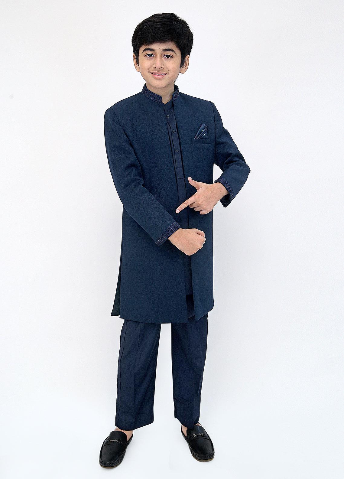 The Navy Blue Front Open Kids Sherwani is a stylish and elegant choice for young boys. Designed with a contemporary front-open style, this sherwani combines modern aesthetics with traditional charm. Made from premium fabrics, it ensures comfort and ease of movement, making it perfect for weddings, festivals, and special occasions. The rich navy blue color adds a touch of sophistication, while intricate details enhance its overall appeal. This sherwani will make your little one stand out, blending tradition and fashion seamlessly.