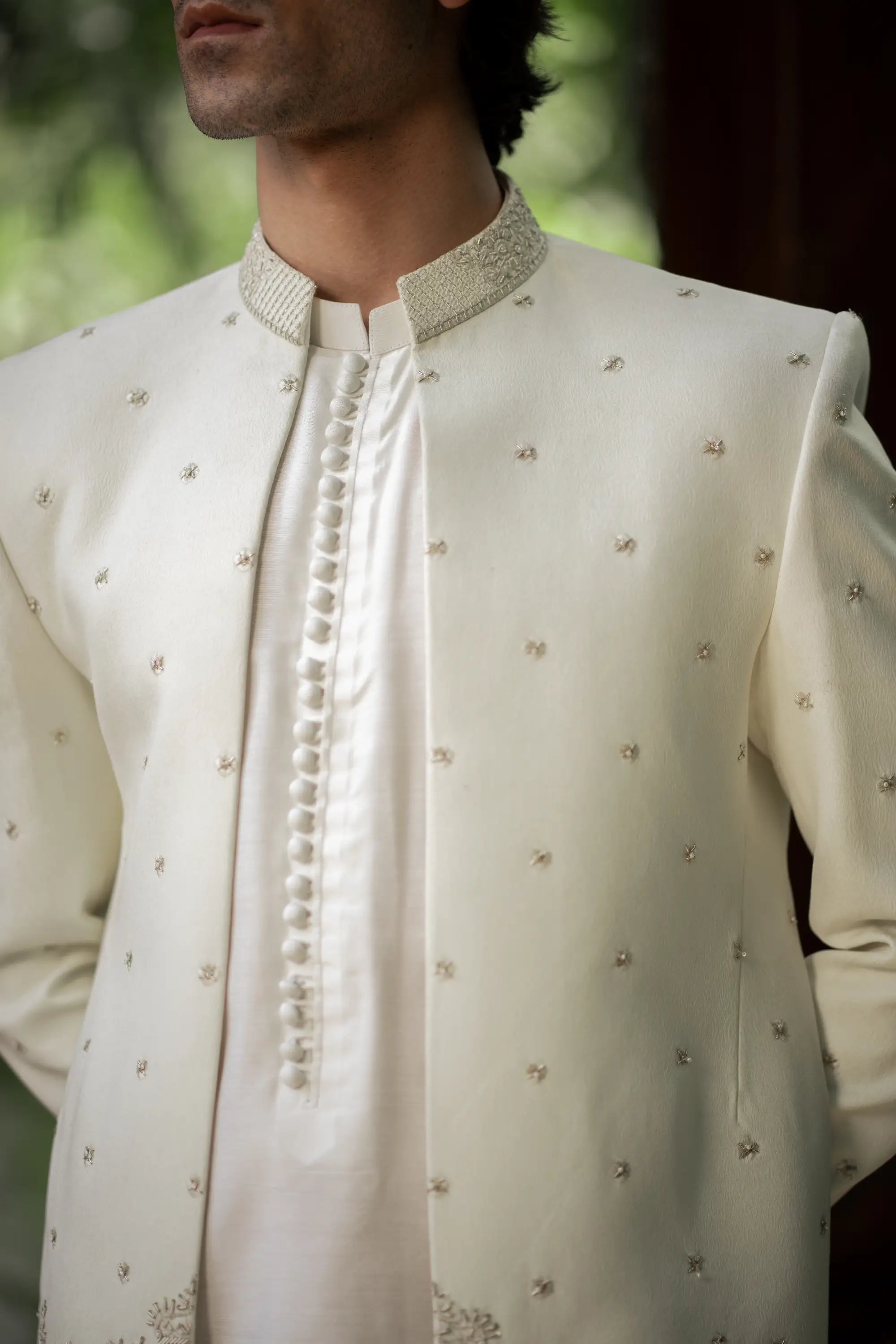 White and Gold Embroidered Front Open Sherwani PC-5150