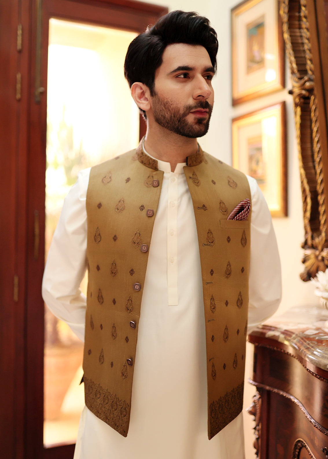 Show up in style with an intricately embroidered waistcoat to complete your look. Buy men golden waistcoat from Stylish Garments. We have a complete range of embroidered waistcoat in very high-quality fabric stuff. Complete men's eastern clothing range including men's sherwanis, men's shalwar kameez and waistcoat latest collection available. You can easily order it from any corner of Pakistan because we are delivering it all over Pakistan.
